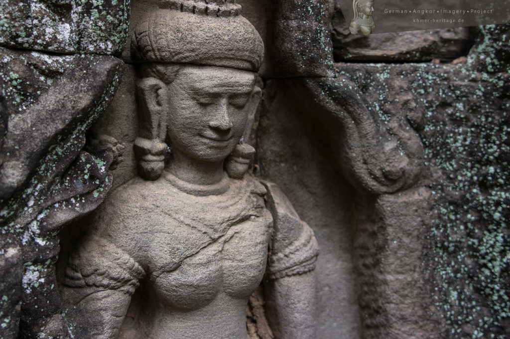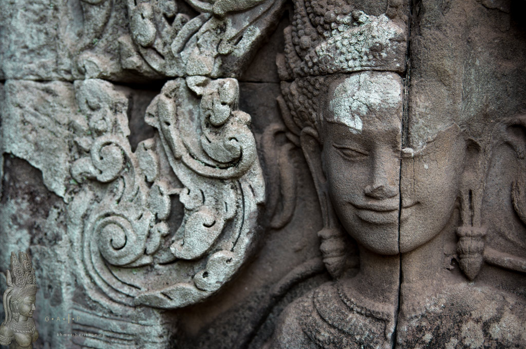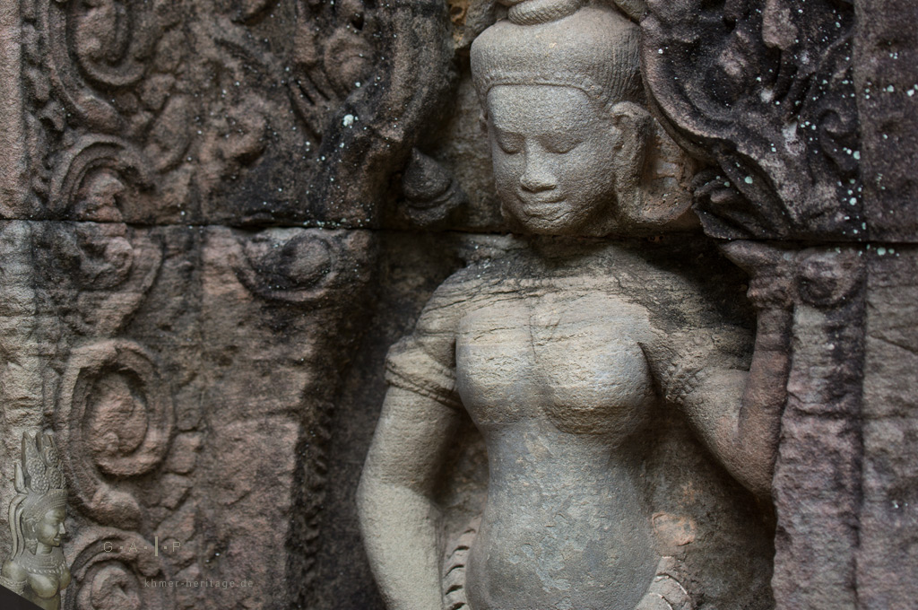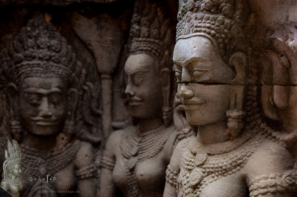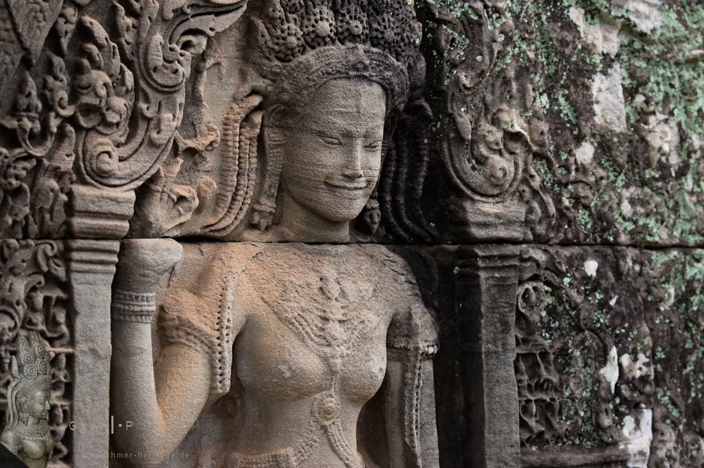 Ein immer wiederkehrendes Thema in den relegiösen Ruinen sind die skulpturalen Darstellungen von Apsaras und Devatas. Mit filigranen Haartrachten, reichem Zierrat aus Ringen, Armbändern und Halsketten sowie graziösen Posen gleicht keines dieses göttlichen Wesen der anderen.